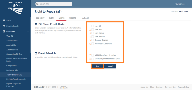 In this quick post, we will cover how you can set up email alerts in BillTrack50 in three easy steps. An “alert” is simply a helpful daily email that offers an overview of what happened with the bills you are tracking yesterday. You can always review your alerts for your bill sheets on the alerts section of the Navigation bar.