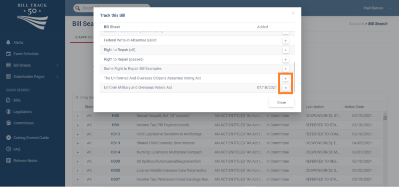 Click the bill number to see a bill. If you are a subscriber, you can also click on the “+” next to its State to add that bill to one of your bill lists to track. When you click the “+” a window will pop-up with a list of your bill sheets, simply click the “+” next to the corresponding bill sheet and it will be added to that sheet. If instead of a “+” there is an “X” then that means this bill is already on that Bill Sheet, clicking on the “X” will remove it from your sheet.