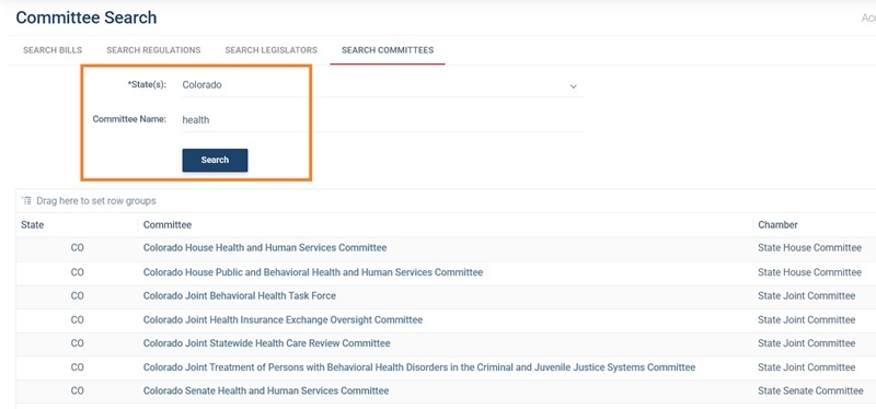 Search by entering a word or words from the committee title and selecting the states you are interested in.