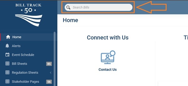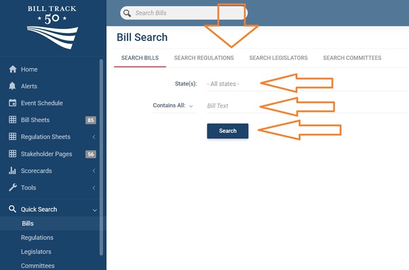 Quick search for bills, legislators, and committees is available to all BillTrack50 users, whether you have a free account or a subscription. However, the regulations search is only an option for users with a regulations subscription.