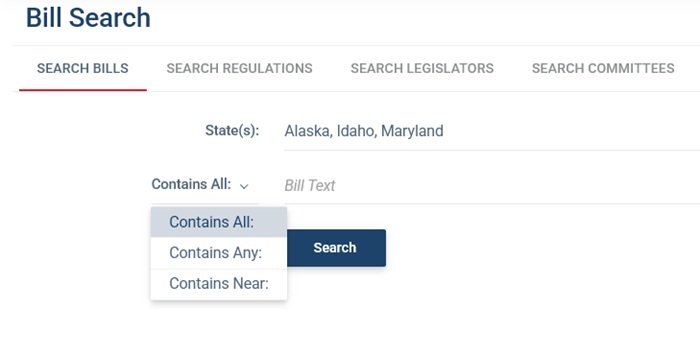 There are three options for searching. Contains All means that all the words and phrases you type must be contained in a bill for it to appear. You can click 'Contains All' to change that option to Contains Any (only one of the words or phrases needs to appear in a bill) or Contains Near (add a phrase where there may be variations in exactly how it is expressed in bills).