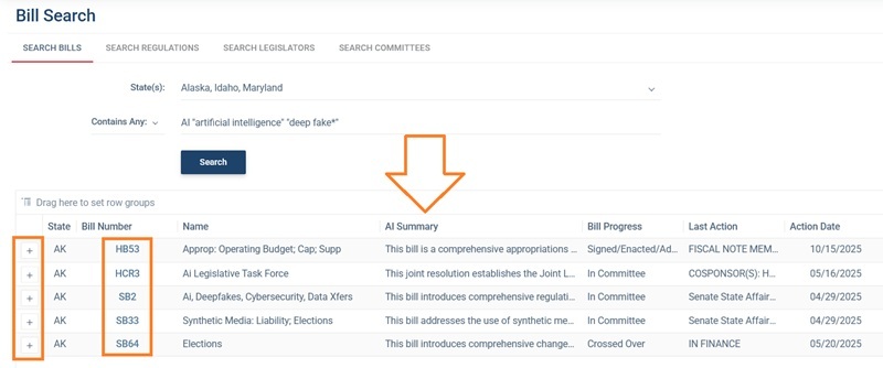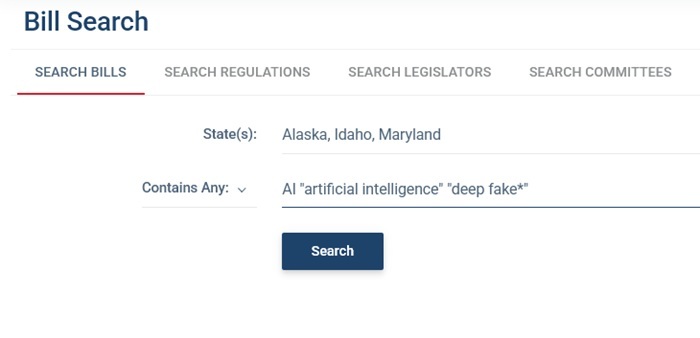 So, if I'm looking for AI bills in Alaska, Idaho, and Maryland I may create a search that looks like this: