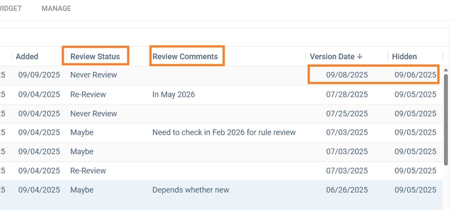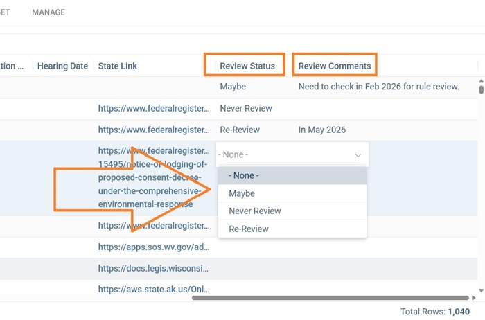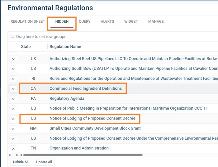 I can periodically review the regulations that I've hidden in the Hidden tab, and using the information in the Review Status and Review Comments columns I can decide whether I need to take another look at them.