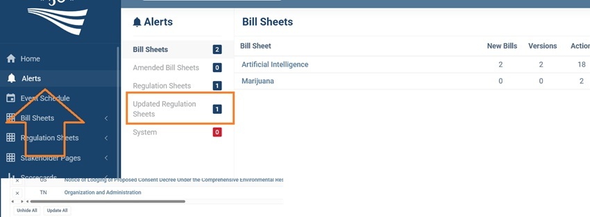 It defaults to bill sheets, but you can see an option for Updated Regulation Sheets. This option shows you when a regulation that you have hidden has subsequently been updated - i.e. it has a new document of some kind. You can see that I have one regulation sheet with a hidden regulation update. I can click Updated Regulation Sheets to see the regulation sheet: