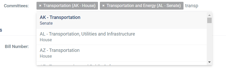 Here, I've chosen Colorado and Texas as my states so it shows me committees from both states. The committee filter will limit your existing results to bills that were ever assigned to the committee(s) in question, NOT just bills currently in that committee.